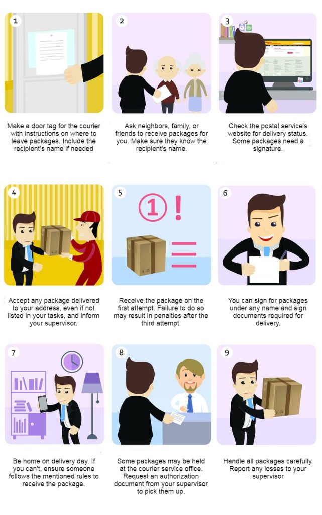 - Accepting Packages. Accept and receive any package delivered to your address, even if not on the task list. Inform your supervisor via the tasks panel or text message.