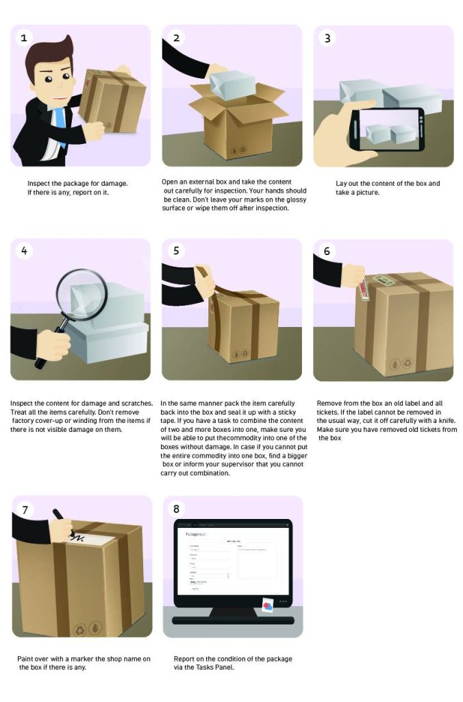 - Take pictures. An invoice, the content of the box, outer box. Upload them into the tasks system. For taking a picture of the content, put it on the table carefully (if the commodity is heavy, it’s acceptable to leave it in the box). Take a picture of the whole content of the box. We should see the content of the box in the picture clearly. If the commodity has damage of the packing box or the items, take an additional picture of damage.